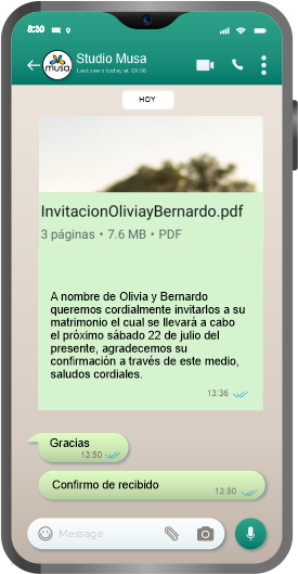 Tres meses antes del evento se envían las invitaciones a través de WhatsApp, utilizando una lista de contactos que tú nos proporcionas. También podemos realizar la confirmación poniéndonos nuevamente en contacto con tus invitados y asignarles el número de pases por invitación.